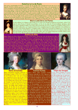 Katarina la 2-a de Rusio Estis grava imperiestrino de Rusio. La tempo de ŝia regado estas konsiderata la ora erao de la rusa imperio. Ŝi havis nobelan germanan originon. En 1744, kiam ŝi estis 15-jara, estis prezentata al la carino Elizabeta Petrovna kiel kandidatino por edziniĝi al la princo Petro Teodoroviĉo. Ŝi penis ler- ni la rusan lingvon, kulturon kaj religion, kaj sukcesis esti elektita kiel edzino de la heredonto. En 1754 nakiĝis Paŭlo, la ido de la princa geparo. En 1762 Petro iĝis caro; la interrilatoj de la geparo ne estis bonaj kaj de tiam iĝis pli malbonaj. Duma la maniero regadi de Petro vekis malkontenton en la militistaro kaj aliaj sektotoj de la rusa socio. Katarina sciis profiti la situacion por puĉi kontraŭ sia edzo. Ĉi tiu sin vidis devigita abdiki; poste li estis arestita kaj baldaŭ pereis, verŝajne murdita. Oni proklamis kaj kronis Katerinon kiel imperiestrino kaj dum la sekvintaj 32 jarojn, ĝis ŝia morto en 1796, ŝi regadis la imperion prenante dispoziciojn por la plibonigo de ĉiuj aferoj de la lando. Maria Ludovikino de Parmo Ŝi estis edzino de la hispana reĝo Karlo la 4-a, lasta el la Malnova Reĝimo en tiu lando, ekde 1765, kiam ŝi estis 14-jara. Ŝi akuŝis sep gefilojn, ne ĉiuj el sia edzo ĉar ŝi havis kelkajn amantojn, inter kiuj elstaris Manuel Godojo kiu krome estis promociita de ŝi al la regado de la hispana lando kaj im- perio kiel ĉefministro. La vaganta politiko de tiu ministro dum tiuj jaroj kontribuis al la politika ka- tastrofo en kiu dronis Hispanio: la sepjara milito (1808-1815) kontraŭ la okupado de la lando far la napoleona armeo. El tiu ĥaosa etapo ne supervivis la reĝandon de Karlo la 4-a. Li kaj lia edzino Ma- ria Ludovikino de Parmo restis ekzititaj ekde 1808, unue en Francio kaj poste en Italio, dum la cete- ro el siaj vivoj. Maria Ludovikino mortis komence de la jaro 1819. Dukino de Albo Maria Tereza de Silva Alvarez de Toledo (1762-1802). Krom tiu titolo de dukino de Albo, ŝi havis multajn aliajn: tri dukecoj, ok markizecoj, 13 grafecoj, kvar baronecoj kaj unu sinjoreco, kaj post la morto de sia edzo, sen idaro, ŝi heredis kromajn titolojn: du princecoj, kvar dukecoj, ok markezecoj, ok grafecoj kaj unu baroneco. Aldonindas ke, fakte, ĉiuj tiuj titoloj implicis la posedadon de feŭdaj teritorioj. Ŝi estis, sendube, la plej riĉa ino en la lando, eble pli ol la tiama reĝino, Maria Ludovikino de Parmo. Ambaŭ inoj estis rivalaj kaj ne nur en kio rilatas al riĉeco ĉar ambaŭ konkuris por atingi la seksajn favorojn de samaj viroj, ĉefe la ministro Godojo. Pri la rivaleco inter ambaŭ altrangulinoj oni konas tiu kazon kiam, en iu solena festo de la aristokrat- aro, la dukino de Albo prezentiĝis kun siaj servistinoj kiuj iris vestitaj per roboj tute egalaj al tiu kiun portis la reĝino. Estas iu filmo, Volaverunt, pri tiu kortego, per kiu oni prezentas la tezon ke la reĝino kulpas pri la frua kaj stranga morto de la dukino. Maria Antonietta Karlota Kordaj Olipia de Gouges Maria Antonietta Jozefino Johanino de France, Marie Anne Charlote Corday France, Marie-Olympe de Gouze, Habsburgo-Loreno (1755-1793), estis reĝ-d´Armont, naskiĝis en 1768. Ŝajnas ke ŝi naskiĝis en 1748. Ŝi estis verkist- ino de Francio ekde 1774 pro edziniĝo posteŭlino de la aŭtoro Pierre Corneille, ino kaj politikistino kiu partopre- nis en la Franca Revolucio. Je sia kun Ludoviko la 16-a. Ĝis la jaro 1789, sed la historio memoras ŝin pro ŝia kon- 18-a jaro ŝi edziniĝis kaj post kel- komenciĝo de la Franca Revolucio, ŝi vi- kreta faro dum la Franca Revolucio, t. e. kaj monatoj naskis filon. Ŝia ed- vis en la lukso kaj splendo de la kortego la murdo de Jean-Paŭl Marat. La evento zo mortis baldaŭ, tamen Maria ne de Versajlo. Ŝi, pro ties fremda deveno, enkadriĝas en la situacio de interfrontiĝo reedziniĝis pro seniluziiĝo pri la komence ne ĝuis la amon de la franca pro la kontraŭdiroj inter la revoluciaj edzineco, kiu donis al ŝi nenian popolo. Tia teniĝo iome ŝanĝiĝis post la tendencoj de la jakobenoj kaj la ĝirond- feliĉon, tiel ke ŝi eĉ priskribis la naskiĝo de la idaro de la reĝa geparo. istoj. La jakobeno Marato estis inter la geedziĝon kiel tombejo de fido Dum la unuaj jaroj de la Revolucio, ŝi plej radikalaj malamikoj de la ĝirondis- kaj amo, kvankam ŝi havis am- konspiris, kun sia edzo, por ke ŝia frato, toj kaj aliaj kolektivoj, revoluciaj aŭ ne, rilaton kun iu ŝtatoficisto. Aŭtor- la imperiestro de Aŭstrio, militu kontraŭ ino de la Deklaracio pri la Vir- la revolucia reĝimo, kaj eĉ intencis fuĝi kaj instigadis kontraŭ ili perforton ekde inaj kaj Civitanaj Rajtoj, ŝi mul- eksterlanden. Fiaskinta en tiu plano kaj la paĝoj de la ĵurnalo kiun li publikig- te verkis favore al civilaj kaj po- malkovrita la konspiro, la reĝa geparo es- adis. Karlota implikiĝis en tiun konflik- litikaj rajtoj de la inoj kaj al abo- licio de la sklaveco. En 1793, ŝi tis enkarcerigita de la revoluciuloj. Ludo- ton kaj la 18-an de julio de 1793 prezent- akre atakis la responsulojn de la viko la 16-a estis juĝita kaj senkapigita iĝis en la domo Jen-Paŭl kaj sukcesis septembraj masakroj de malliber- komence de la jaro 1792, kaj Maria An- aliri al la ĉambro kie li estis en banujo uloj. Fine ankaŭ ŝi estis mortigita tonietta suferis saman sorton en oktobro kaj tie perponarde mortigis lin. Ŝi estis per gilotino en Parizo la 3-an de de 1793. poste gilotinita. novembro de 1793. 48